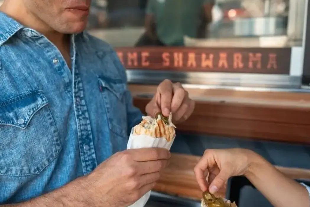 Shawarma is often eaten as a sandwich or a wrap. Cucumbers, tomatoes, pickled vegetables and onions can be used as garnish. You can get fries or hummus at a variety of places. The wrap and veggies help to balance off the meatiness in this meal.